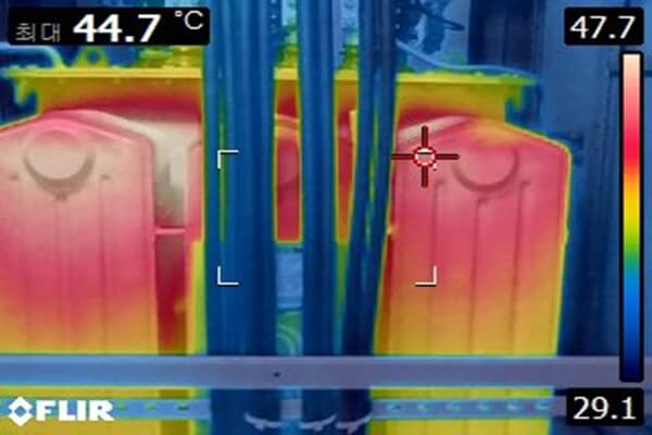하지만 우리가 변압기 점검 시 진짜로 경계해야 할 것은 평소와 다른 ‘날카로운 이음(찢어지는 소리)’과 **’타는 냄새’입니다. 순찰 중 이런 이상 징후를 발견했다면 즉시 열화상 카메라를 챙겨와 변압기 부싱(전선 연결부)이나 단자대의 온도를 찍어봐야 합니다. 접속 불량으로 인한 발열은 열화상 카메라에 붉게 나타나며, 이 초기 대응 하나가 수억 원의 자산 피해를 막는 결정적 역할을 합니다.
